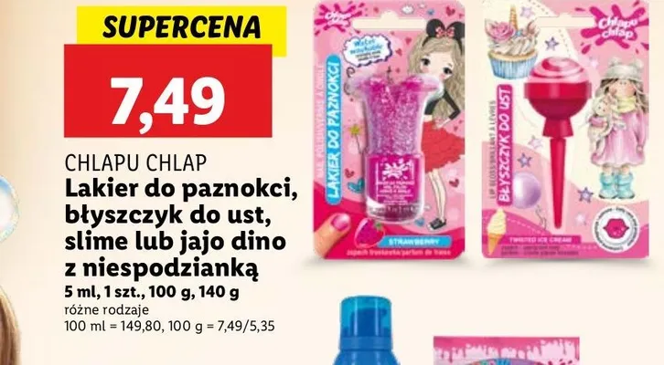 Cena produktu r贸偶ni si臋 w zale偶no艣ci od wybranego sklepu. Niestety nie posiadamy danych o aktualnych promocjach, jednak w艣r贸d archiwalnych ofert Lakier do paznokci zmywalny wod膮 r贸偶owy Chlapu chlap kosztuje od 4,99 z艂 do 7,49 z艂.