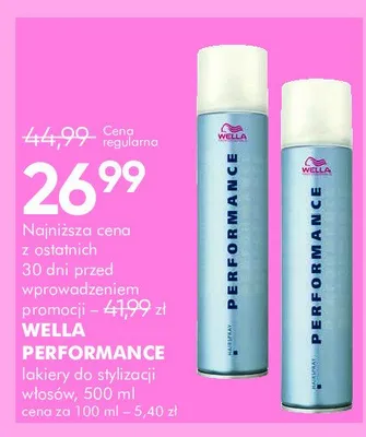 Cena produktu r贸偶ni si臋 w zale偶no艣ci od wybranego sklepu. Niestety nie posiadamy danych o aktualnych promocjach, jednak w艣r贸d archiwalnych ofert Lakier do w艂os贸w mocno utrwalaj膮cy Wella professionals performance kosztuje od 24,99 z艂 do 34,79 z艂.