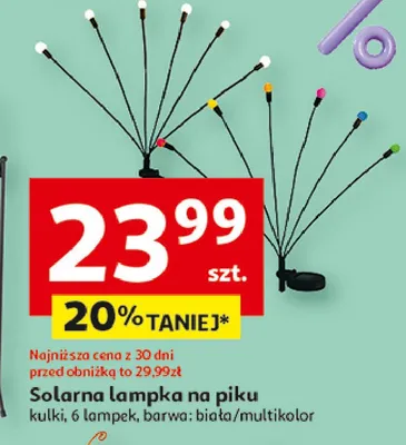 Cena produktu r贸偶ni si臋 w zale偶no艣ci od wybranego sklepu. Produkt Lampka solarna na piku mo偶esz kupi膰 w promocji ju偶 od 6,5 z艂 do 29,99 z艂. Najta艅sza oferta, jak膮 mamy w naszej bazie jest z sieci Auchan. Lampka solarna na piku kosztuje aktualnie 6,5 z艂. Zobacz ofert臋