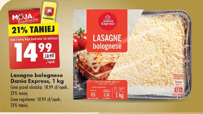 Zastanawiasz si臋, gdzie kupi膰 i ile kosztuje produkt Lasagne bolognese Danie express? Regularnie sprawdzamy, czy jest promocja na ten produkt w Biedronka, Lidl, Kaufland, Auchan, Netto, Makro i innych sklepach. Aktualnie posiadamy 2 oferty promocyjne na ten produkt. Ceny zaczynaj膮 si臋 od 9,69z艂!