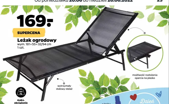Zastanawiasz si臋, gdzie kupi膰 i ile kosztuje produkt Le偶ak ogrodowy 181 x 55 x 32/94 cm? Regularnie sprawdzamy, czy jest promocja na ten produkt w Biedronka, Lidl, Kaufland, Auchan, Netto, Makro i innych sklepach. Aktualnie nie posiadamy ofert promocyjnych na ten produkt.