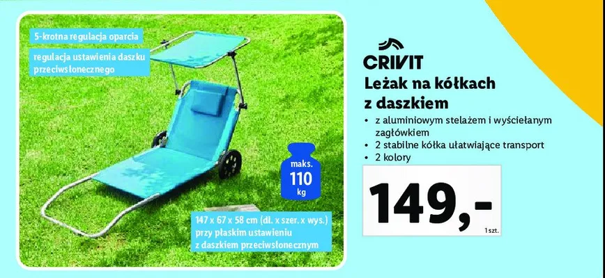 Cena produktu różni się w zależności od wybranego sklepu. Niestety nie posiadamy danych o aktualnych promocjach, jednak wśród archiwalnych ofert Leżak plażowy na kółkach z daszkiem Crivit kosztuje od 119 zł do 149 zł.
