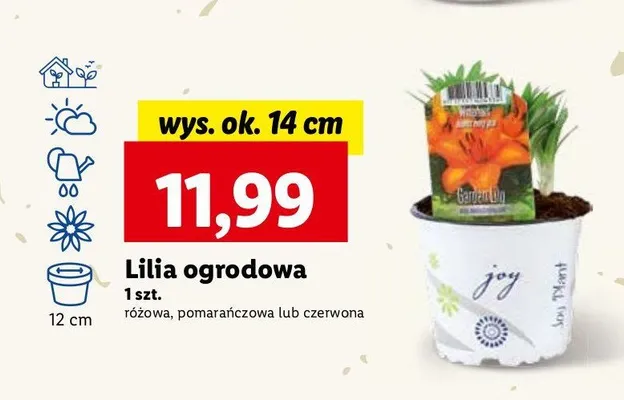 Cena produktu r贸偶ni si臋 w zale偶no艣ci od wybranego sklepu. Produkt Lilia ogrodowa r贸偶owa doniczka 12 cm mo偶esz kupi膰 w promocji ju偶 od 24,99 z艂. Najta艅sza oferta, jak膮 mamy w naszej bazie jest z sieci Lidl. Lilia ogrodowa r贸偶owa doniczka 12 cm kosztuje aktualnie 24,99 z艂. Zobacz ofert臋
