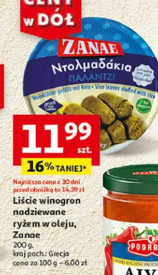 Cena produktu różni się w zależności od wybranego sklepu. Niestety nie posiadamy danych o aktualnych promocjach, jednak wśród archiwalnych ofert Liście winorośli nadziewane ryżem ZANAE kosztuje od 11,99 zł.