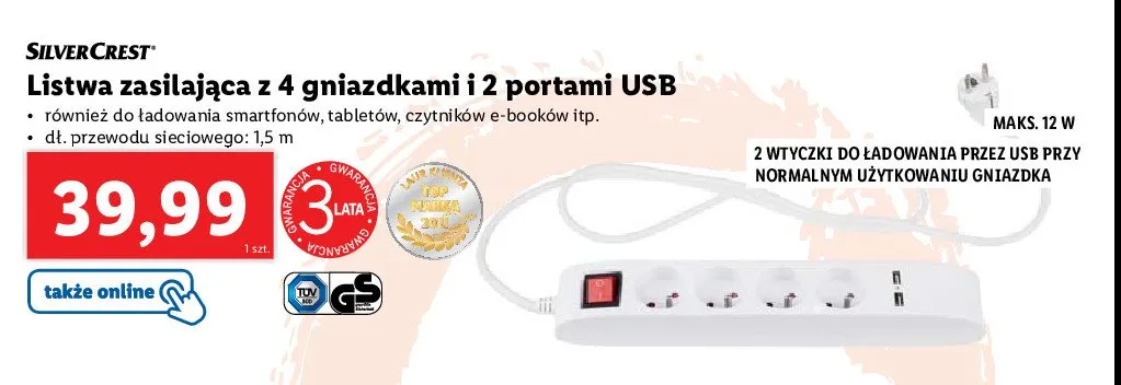 Ile kosztuje Listwa zasilaj膮ca 4 gniazda i 2 porty usb Silvercrest?