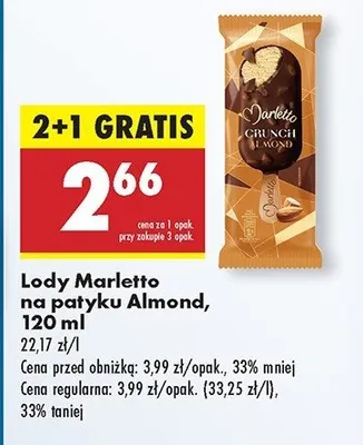 Cena produktu r贸偶ni si臋 w zale偶no艣ci od wybranego sklepu. Niestety nie posiadamy danych o aktualnych promocjach, jednak w艣r贸d archiwalnych ofert L贸d almond Marletto kosztuje od 1 z艂 do 2,99 z艂.