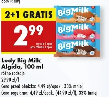 Cena produktu r贸偶ni si臋 w zale偶no艣ci od wybranego sklepu. Niestety nie posiadamy danych o aktualnych promocjach, jednak w艣r贸d archiwalnych ofert L贸d fruit Algida big milk kosztuje od 2,79 z艂 do 4,19 z艂.
