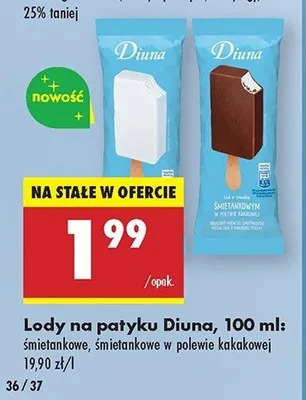 Cena produktu r贸偶ni si臋 w zale偶no艣ci od wybranego sklepu. Niestety nie posiadamy danych o aktualnych promocjach, jednak w艣r贸d archiwalnych ofert L贸d 艣mietankowy Diuna kosztuje od 1,99 z艂.