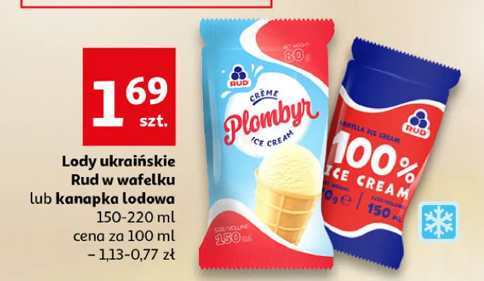 Cena produktu r贸偶ni si臋 w zale偶no艣ci od wybranego sklepu. Niestety nie posiadamy danych o aktualnych promocjach, jednak w艣r贸d archiwalnych ofert L贸d w wafelku RUDD kosztuje od 1,69 z艂.