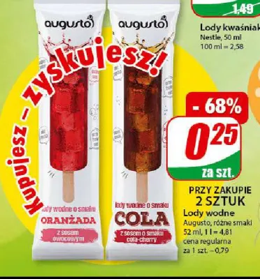 Cena produktu r贸偶ni si臋 w zale偶no艣ci od wybranego sklepu. Niestety nie posiadamy danych o aktualnych promocjach, jednak w艣r贸d archiwalnych ofert L贸d wodny o samku oran偶ada Augusto kosztuje od 0,79 z艂.