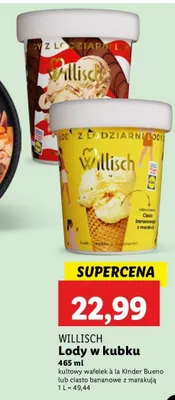 Cena produktu r贸偶ni si臋 w zale偶no艣ci od wybranego sklepu. Niestety nie posiadamy danych o aktualnych promocjach, jednak w艣r贸d archiwalnych ofert Lody kultowy wafelek a la kinder bueno Willisch kosztuje od 22,99 z艂.