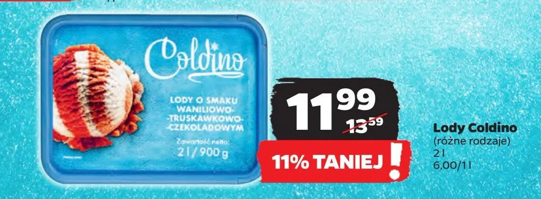 Zastanawiasz si臋, gdzie kupi膰 i ile kosztuje produkt Lody o samku waniliowo - truskawkowo - czekoladowym Coldino? Regularnie sprawdzamy, czy jest promocja na ten produkt w Biedronka, Lidl, Kaufland, Auchan, Netto, Makro i innych sklepach. Aktualnie nie posiadamy ofert promocyjnych na ten produkt.