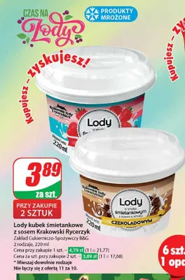 Cena produktu r贸偶ni si臋 w zale偶no艣ci od wybranego sklepu. Niestety nie posiadamy danych o aktualnych promocjach, jednak w艣r贸d archiwalnych ofert Lody 艣mietankowe z sosem czekoladowym Krakowskie lody z rycerzykiem kosztuje od 3,79 z艂 do 3,89 z艂.