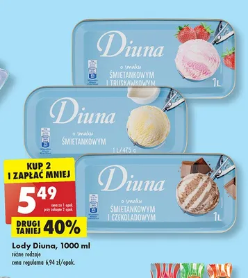 Cena produktu r贸偶ni si臋 w zale偶no艣ci od wybranego sklepu. Niestety nie posiadamy danych o aktualnych promocjach, jednak w艣r贸d archiwalnych ofert Lody 艣mietankowo-czekoladowe Diuna kosztuje od 5,49 z艂.