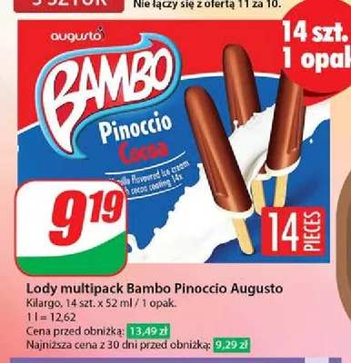 Cena produktu r贸偶ni si臋 w zale偶no艣ci od wybranego sklepu. Niestety nie posiadamy danych o aktualnych promocjach, jednak w艣r贸d archiwalnych ofert Lody w polewie kakaowej Augusto bambo kosztuje od 9,19 z艂 do 11,29 z艂.