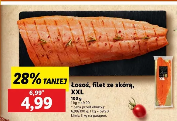 Cena produktu różni się w zależności od wybranego sklepu. Produkt Łosoś atlantycki xxl filet ze skórą Connoisseur możesz kupić w promocji już od 4,99 zł do 24,99 zł. Najtańsza oferta, jaką mamy w naszej bazie jest z sieci Aldi. Łosoś atlantycki xxl filet ze skórą Connoisseur kosztuje aktualnie 4,99 zł. Zobacz ofertę