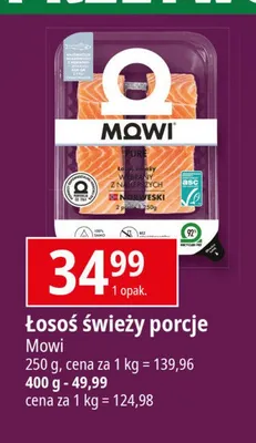 Cena produktu różni się w zależności od wybranego sklepu. Niestety nie posiadamy danych o aktualnych promocjach, jednak wśród archiwalnych ofert Łosoś świeży porcje Mowi kosztuje od 49,99 zł do 55,99 zł.