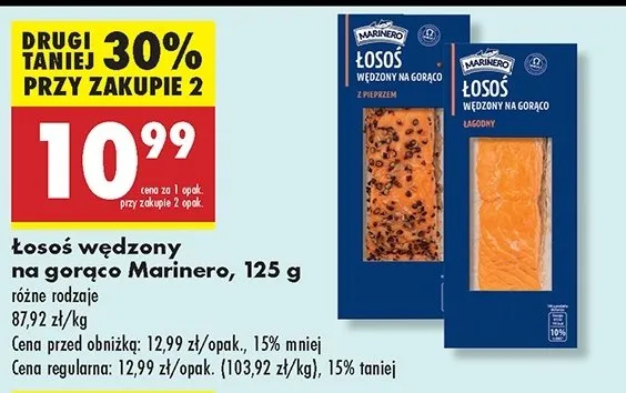 Cena produktu różni się w zależności od wybranego sklepu. Niestety nie posiadamy danych o aktualnych promocjach, jednak wśród archiwalnych ofert Łosoś wędzony na ciepło w pieprzu Marinero kosztuje od 10,49 zł do 10,99 zł.