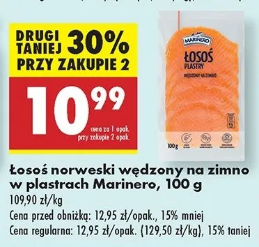 Cena produktu r贸偶ni si臋 w zale偶no艣ci od wybranego sklepu. Produkt 艁oso艣 w臋dzony na zimno plastry Marinero mo偶esz kupi膰 w promocji ju偶 od 18,99 z艂. Najta艅sza oferta, jak膮 mamy w naszej bazie jest z sieci Biedronka. 艁oso艣 w臋dzony na zimno plastry Marinero kosztuje aktualnie 18,99 z艂. Zobacz ofert臋