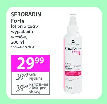 Cena produktu r贸偶ni si臋 w zale偶no艣ci od wybranego sklepu. Niestety nie posiadamy danych o aktualnych promocjach, jednak w艣r贸d archiwalnych ofert Lotion przeciw wypadaniu w艂os贸w Seboradin forte kosztuje od 28,79 z艂 do 29,99 z艂.