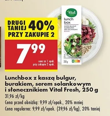 Cena produktu r贸偶ni si臋 w zale偶no艣ci od wybranego sklepu. Niestety nie posiadamy danych o aktualnych promocjach, jednak w艣r贸d archiwalnych ofert Lunchbox z kasz膮 bulgur burakiem serem solankowym i s艂onecznikiem Vital fresh kosztuje od 7,19 z艂 do 7,99 z艂.