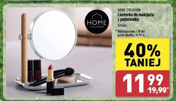 Cena produktu różni się w zależności od wybranego sklepu. Niestety nie posiadamy danych o aktualnych promocjach, jednak wśród archiwalnych ofert Lusterko do makijażu z podstawką Home creation kosztuje od 11,99 zł do 19,99 zł.