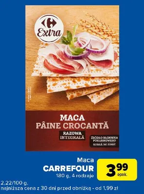 Cena produktu r贸偶ni si臋 w zale偶no艣ci od wybranego sklepu. Niestety nie posiadamy danych o aktualnych promocjach, jednak w艣r贸d archiwalnych ofert Maca razowa Carrefour kosztuje od 2,69 z艂 do 3,99 z艂.
