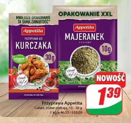 Cena produktu r贸偶ni si臋 w zale偶no艣ci od wybranego sklepu. Niestety nie posiadamy danych o aktualnych promocjach, jednak w艣r贸d archiwalnych ofert Majeranek Appetita kosztuje od 1,39 z艂.