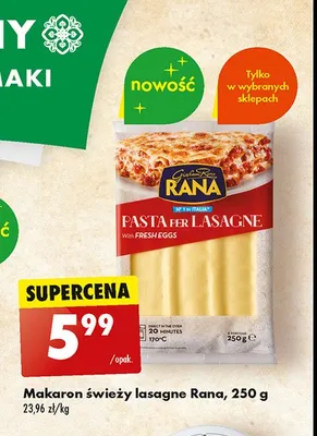 Cena produktu r贸偶ni si臋 w zale偶no艣ci od wybranego sklepu. Niestety nie posiadamy danych o aktualnych promocjach, jednak w艣r贸d archiwalnych ofert Makaron do lasagne Giovanni rana kosztuje od 5,49 z艂 do 5,99 z艂.