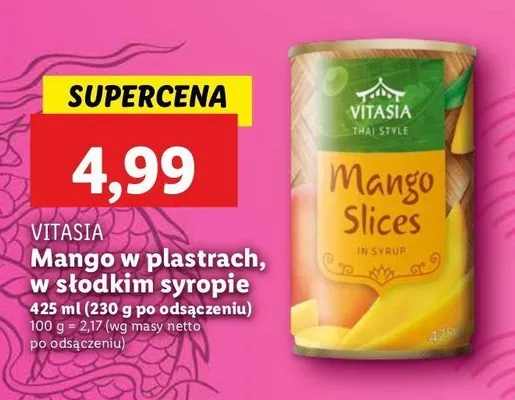 Zastanawiasz si臋, gdzie kupi膰 i ile kosztuje produkt Mango w plastrach Vitasia? Regularnie sprawdzamy, czy jest promocja na ten produkt w Biedronka, Lidl, Kaufland, Auchan, Netto, Makro i innych sklepach. Aktualnie nie posiadamy ofert promocyjnych na ten produkt.