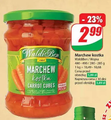 Cena produktu r贸偶ni si臋 w zale偶no艣ci od wybranego sklepu. Niestety nie posiadamy danych o aktualnych promocjach, jednak w艣r贸d archiwalnych ofert Marchew kostka Waldiben kosztuje od 2,49 z艂 do 2,99 z艂.