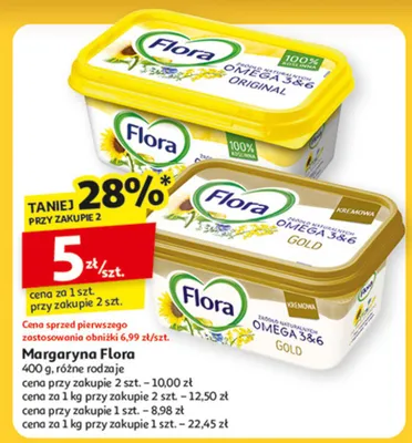 Cena produktu r贸偶ni si臋 w zale偶no艣ci od wybranego sklepu. Produkt Margaryna Flora gold mo偶esz kupi膰 w promocji ju偶 od 8,49 z艂. Najta艅sza oferta, jak膮 mamy w naszej bazie jest z sieci Lidl. Margaryna Flora gold kosztuje aktualnie 8,49 z艂. Zobacz ofert臋