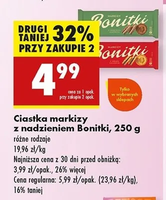 Cena produktu r贸偶ni si臋 w zale偶no艣ci od wybranego sklepu. Niestety nie posiadamy danych o aktualnych promocjach, jednak w艣r贸d archiwalnych ofert Markizy z nadzieniem waniliowym Bonitki kosztuje od 4,99 z艂.