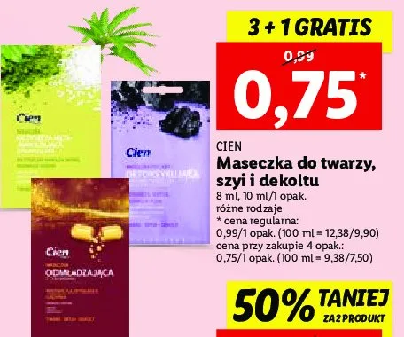 Cena produktu r贸偶ni si臋 w zale偶no艣ci od wybranego sklepu. Niestety nie posiadamy danych o aktualnych promocjach, jednak w艣r贸d archiwalnych ofert Maseczka do twarzy detoksykuj膮ca Cien kosztuje od 0,49 z艂 do 0,99 z艂.