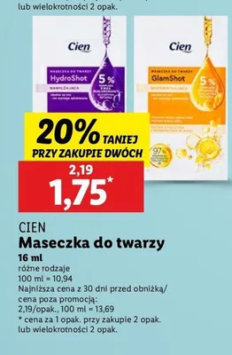Cena produktu różni się w zależności od wybranego sklepu. Niestety nie posiadamy danych o aktualnych promocjach, jednak wśród archiwalnych ofert Maseczka do twarzy hydro shot nawilżająca Cien kosztuje od 1,75 zł.