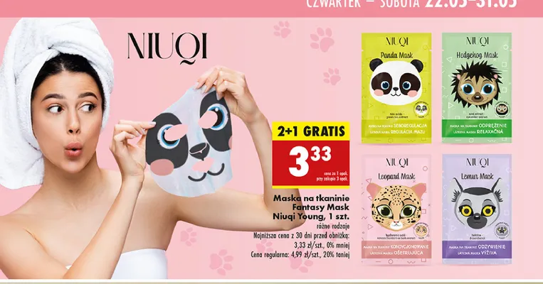 Cena produktu r贸偶ni si臋 w zale偶no艣ci od wybranego sklepu. Niestety nie posiadamy danych o aktualnych promocjach, jednak w艣r贸d archiwalnych ofert Maseczka na tkaninie s艂odka pandziula Niuqi fantasy mask kosztuje od 3,33 z艂 do 3,99 z艂.