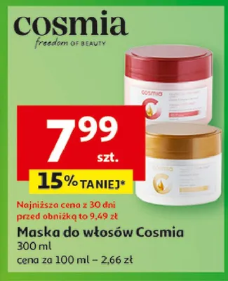 Cena produktu r贸偶ni si臋 w zale偶no艣ci od wybranego sklepu. Niestety nie posiadamy danych o aktualnych promocjach, jednak w艣r贸d archiwalnych ofert Maska do w艂os贸w expert repair Cosmia kosztuje od 7,99 z艂.