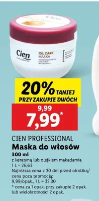 Cena produktu r贸偶ni si臋 w zale偶no艣ci od wybranego sklepu. Niestety nie posiadamy danych o aktualnych promocjach, jednak w艣r贸d archiwalnych ofert Maska do w艂os贸w z olejkiem makadamia Cien kosztuje od 4,89 z艂 do 7,99 z艂.