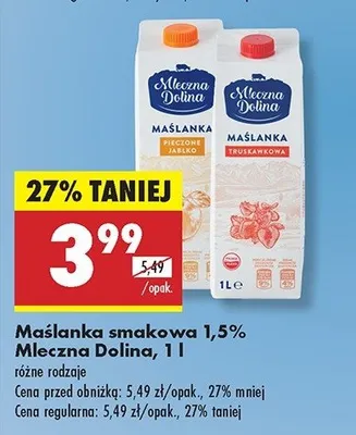 Cena produktu r贸偶ni si臋 w zale偶no艣ci od wybranego sklepu. Niestety nie posiadamy danych o aktualnych promocjach, jednak w艣r贸d archiwalnych ofert Ma艣lanka truskawkowa Mleczna dolina kosztuje od 2,29 z艂 do 3,99 z艂.