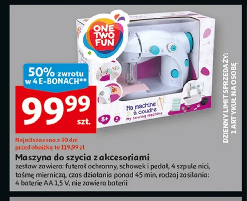 Cena produktu r贸偶ni si臋 w zale偶no艣ci od wybranego sklepu. Niestety nie posiadamy danych o aktualnych promocjach, jednak w艣r贸d archiwalnych ofert Maszyna do szycia One two fun kosztuje od 50 z艂 do 99,99 z艂.