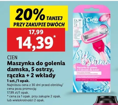 Cena produktu r贸偶ni si臋 w zale偶no艣ci od wybranego sklepu. Niestety nie posiadamy danych o aktualnych promocjach, jednak w艣r贸d archiwalnych ofert Maszynka do golenia + 2 wk艂ady silk & shine Cien kosztuje od 14,39 z艂.