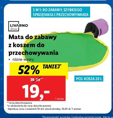 Cena produktu r贸偶ni si臋 w zale偶no艣ci od wybranego sklepu. Niestety nie posiadamy danych o aktualnych promocjach, jednak w艣r贸d archiwalnych ofert Mata do zabawy z koszem do przechowywania kosztuje od 19 z艂 do 39,99 z艂.