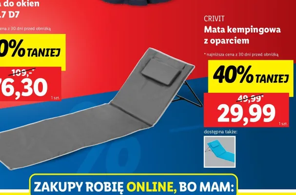 Zastanawiasz si臋, gdzie kupi膰 i ile kosztuje produkt Mata kempingowa z podp贸rk膮 pod plecy 161 x 53 x 2.5 cm Crivit? Regularnie sprawdzamy, czy jest promocja na ten produkt w Biedronka, Lidl, Kaufland, Auchan, Netto, Makro i innych sklepach. Aktualnie nie posiadamy ofert promocyjnych na ten produkt.