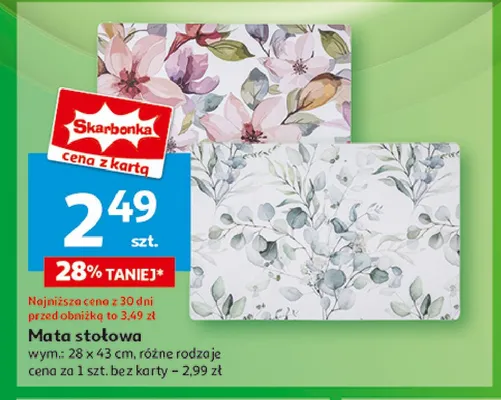 Cena produktu r贸偶ni si臋 w zale偶no艣ci od wybranego sklepu. Niestety nie posiadamy danych o aktualnych promocjach, jednak w艣r贸d archiwalnych ofert Mata sto艂owa 28 x 43 cm kosztuje od 1,99 z艂 do 5 z艂.