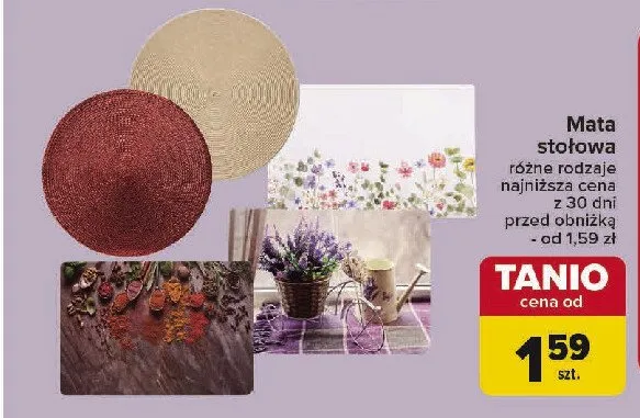 Zastanawiasz si臋, gdzie kupi膰 i ile kosztuje produkt Mata sto艂owa okr膮g艂a? Regularnie sprawdzamy, czy jest promocja na ten produkt w Biedronka, Lidl, Kaufland, Auchan, Netto, Makro i innych sklepach. Aktualnie nie posiadamy ofert promocyjnych na ten produkt.