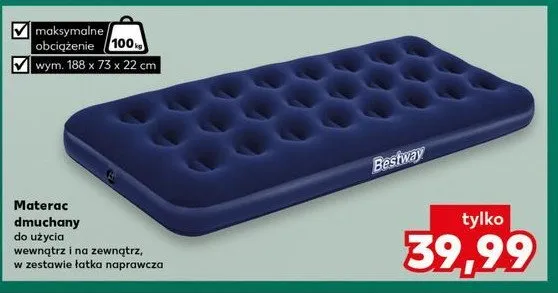Cena produktu r贸偶ni si臋 w zale偶no艣ci od wybranego sklepu. Niestety nie posiadamy danych o aktualnych promocjach, jednak w艣r贸d archiwalnych ofert Materac dmuchany 188 x 73 x 22 cm Bestway kosztuje od 39,99 z艂.
