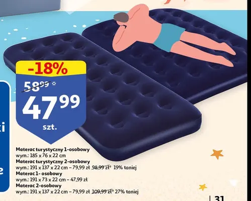 Cena produktu r贸偶ni si臋 w zale偶no艣ci od wybranego sklepu. Produkt Materac flokowany 2-osobowy 191 x 137 x 22 cm mo偶esz kupi膰 w promocji ju偶 od 34,99 z艂. Najta艅sza oferta, jak膮 mamy w naszej bazie jest z sieci Carrefour. Materac flokowany 2-osobowy 191 x 137 x 22 cm kosztuje aktualnie 34,99 z艂. Zobacz ofert臋