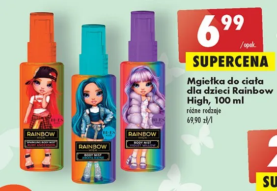Cena produktu r贸偶ni si臋 w zale偶no艣ci od wybranego sklepu. Niestety nie posiadamy danych o aktualnych promocjach, jednak w艣r贸d archiwalnych ofert Mgie艂ja do cia艂a dla dzieci Rainbow high kosztuje od 6,99 z艂.