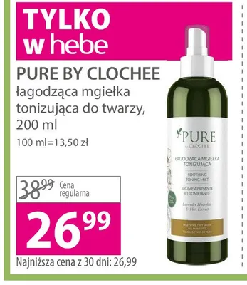 Cena produktu r贸偶ni si臋 w zale偶no艣ci od wybranego sklepu. Niestety nie posiadamy danych o aktualnych promocjach, jednak w艣r贸d archiwalnych ofert Mgie艂ka do twarzy 艂agodz膮ca Pure by clochee kosztuje od 24,49 z艂 do 29,99 z艂.