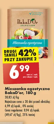 Cena produktu r贸偶ni si臋 w zale偶no艣ci od wybranego sklepu. Niestety nie posiadamy danych o aktualnych promocjach, jednak w艣r贸d archiwalnych ofert Mieszanka egzotyczna Bakad'or kosztuje od 4,99 z艂 do 6,99 z艂.